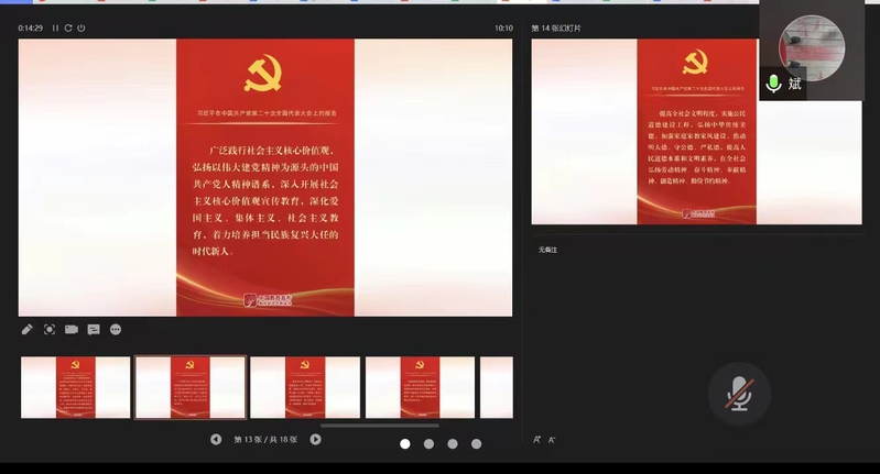 最后,崔斌书记强调,我们支部要把学习贯彻好党的二十大精神作为当前和今后一个时期的重要政治任务,迅速掀起学习党的二十大精神的热潮。要持续跟进学,时刻关注新闻、党报党刊评论性文章等,主动搜集学习资料;要结合实际学,紧密联系岗位工作,做到学而思、学而行,把学习收获体会转化为做好机关党建工作的思路举措,真正使学习入脑入心、见行见效。