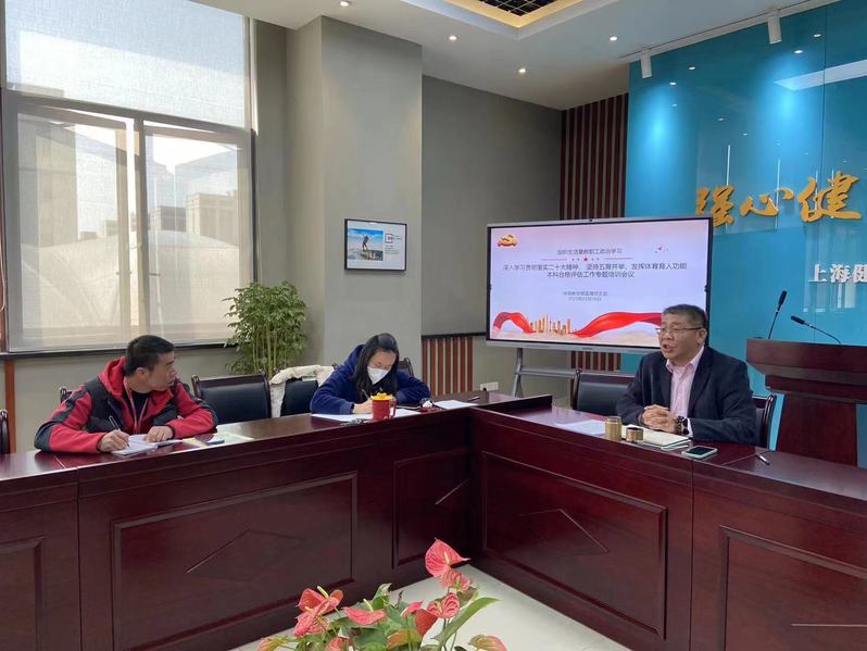 会上,崔斌以坚持“五育并举”,深化体育育人功能为主题,结合党的二十大精神进行了领学,他提到,我们体育教学开展过程中如何有效地将课程思政更好地融入,如何将党的二十大精神融入到我们这次体育教材修订中是需要我们所以体育人去思考和探索的。