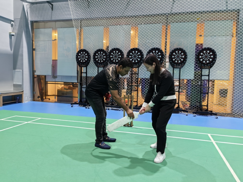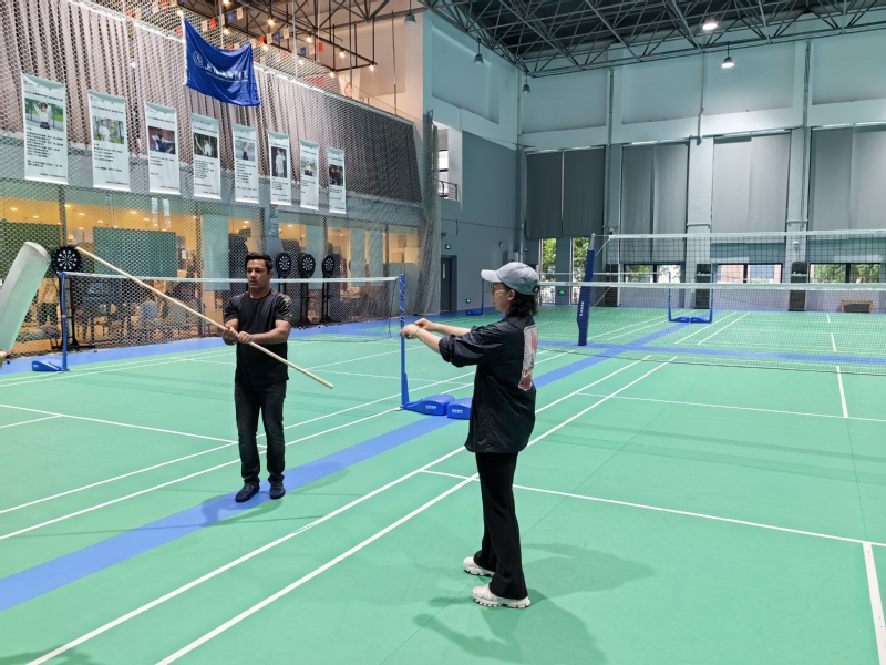 此次教研活动就如何在板球击球教学过程中引导学生思维,对不同落点球选用不同击球技术这一教学重点进行了集体研讨。FAISAL先生从落点分类到不同击球方式进行了逐一的讲解,并在讲解过程中对中英文翻译的准确性与老师们进行了交流和研讨。活动临近结束时,在体育教学部教师的指导下还体验了中国传统武术棍法的巧妙。