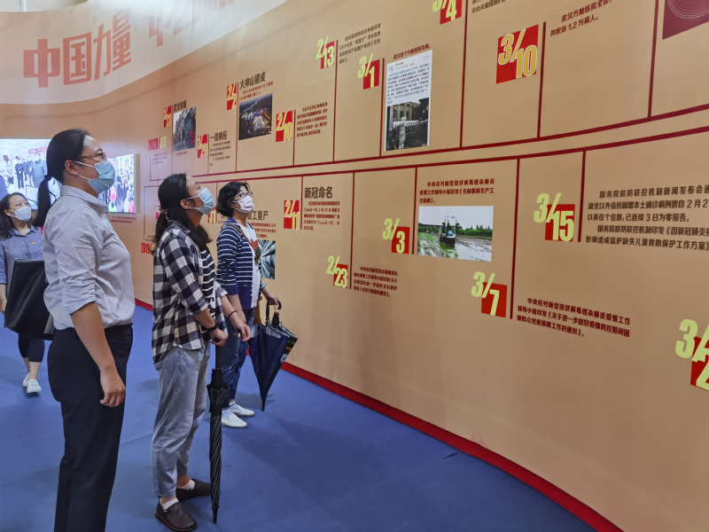 本次展览分为“坚决打赢疫情防控的人民战争”“全力以赴 科学防治”“逆行而上 驰援武汉”“万众一心 联防联控”“守望相助 天下一家”“保障护航 共克时艰”“百舸争流 决战决胜”“凡人英雄 最美守护”“昭示未来 聚力前行”等9个部分。全体教师们逐一参观了各个展区,不时驻足端详,感慨颇深。醒目的巨幅LED屏幕上滚动播放着这场疫情防控阻击战的各个重要时刻、白衣天使逆行出征的背影、护目镜留在脸上深深的压痕、医生与病人共赏“人间值得”的那抹夕阳、“口罩芭蕾”寓意的拼搏奋斗的战疫力量将老师们的思绪瞬间拉回那段感动与悲喜交织的难忘岁月,让全体教师再次感受“我们众志成城”抗击疫情的震撼力量。一股股暖意再度涌上心头,冲击着老师们的心灵,传递着奋斗前行的力量。