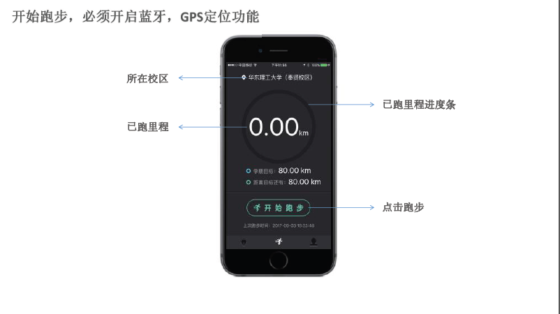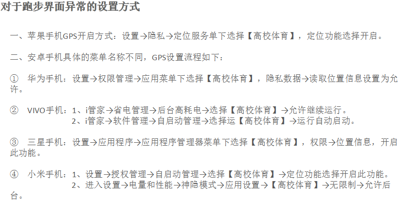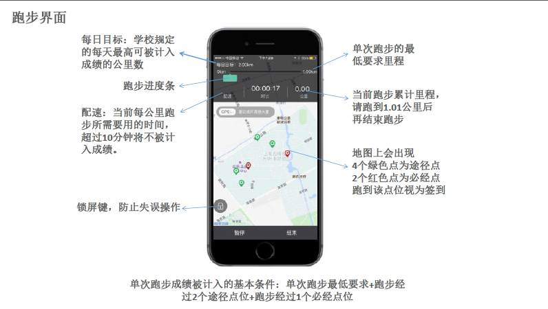 方法:在校园区域,登陆APP“高校体育”,点击开始跑步后,系统自动在校园内生成感应点位,沿着感应点位的路线跑,至少经过2个途径点位(绿色点)和1个必经点位(红色点),直至在规定时间完成本次跑步任务,并保存成绩。(详细的APP使用方法见附件1)