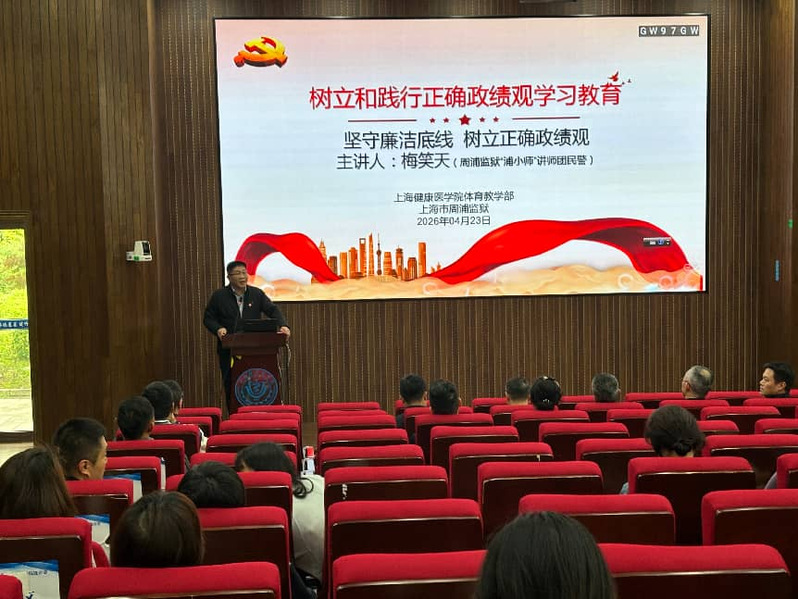 为深入开展树立与践行正确政绩观学习教育,强化廉洁自律意识,推动党建与健康事业深度融合,2026年4月23日下午,上海健康医学院体育教学部直属党支部与上海市周浦监狱,以“党建引领聚合力 健康赋能促发展”为主题,联合开展联组学习活动。上海健康医学院体育教学部、文理教学部、党委宣传部、教师工作部、离退休党总支、继续教育学院等部门党员代表,以及周浦监狱民警代表共同参与学习。