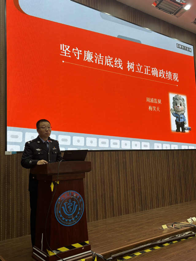 本次活动分为警示教育专题报告与“党建+健康”研讨会两个部分。在南苑E100举行的专题学习报告中,上海市周浦监狱“浦小师”讲师团民警梅笑天以“坚守廉洁底线 树立正确政绩观”为主题作警示教育报告。报告结合工作实践与典型案例,引导全体党员筑牢思想防线、严守纪律规矩,牢固树立和践行正确政绩观,切实把学习成效转化为履职担当的实际行动。